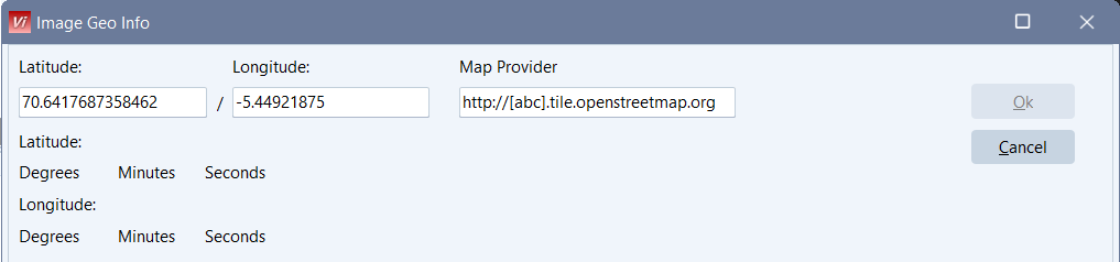 UsageViewer Viewer - Image Geo Info Previous Top Next Latitude / Longitude Ok - Marks Latitude (Dec,Min,Sec and Ref) / Longitude (Dec,Min,Sec and Ref) in to EXIF GPS tags Note! it will not directly Save EXIF Info so don't forget to Save EXIF Info Cancel - Closes Image Geo Info window without making changes