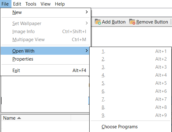 - New -> Folder - Creates new folder - Set Wallpaper - Set wallpaper Tiled, Centered or Stretched - Image Info - Displays image info - Multipage View - Displays Multipage View when there is more than one frame/page in image - Open With - 1..9 opens image with external program - Choose Programs displays External Programs Chooser (See External Programs Chooser) - Properties - Shows properties for selected file(s), folder(s) etc. - Exit - Closes the Viewer program |