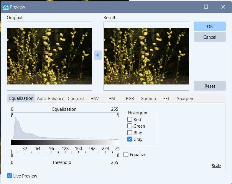 UsageEditor Editor - Color Adjust Previous Top Next There is number of elements what can be adjust in Color Adjustment Preview window: Contrast HSV HSL RGB Equalization FFT Gamma Correction Sharpen