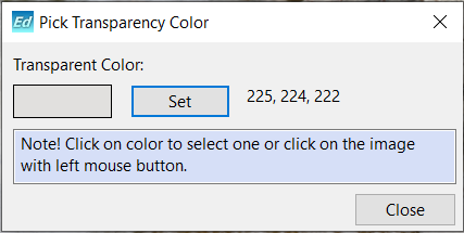 UsageEditor Editor - Pick Transparency Color Previous Top Next Transparent Color - Select color what is turned to transparent Set - Turn selected color as transparent. Note. Point some area and left click mouse button to turn area as transparent Close - Closes the window