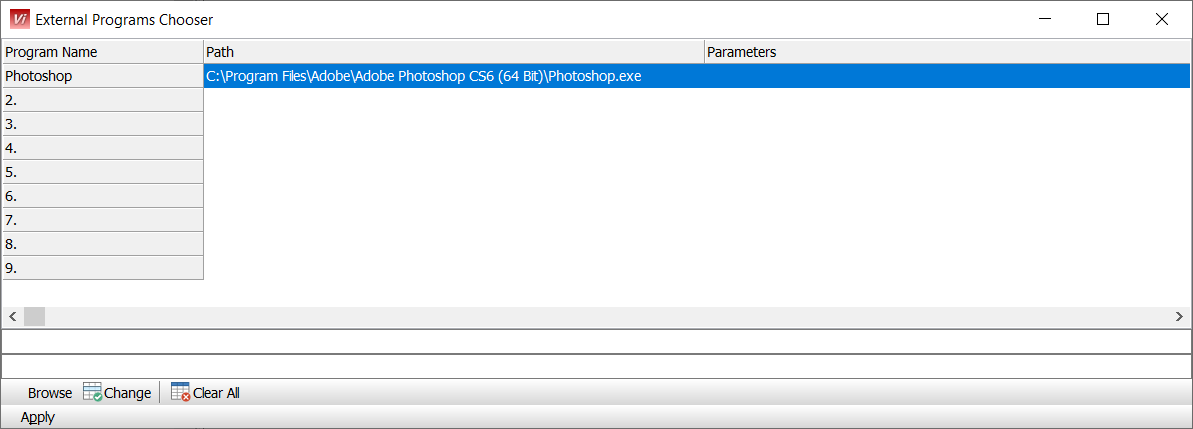 UsageViewer External Programs Chooser Previous Top Next Program Name, Path and Parameters - Displays Program Name, Path and Parameters list Browse - Browse for a external program exe -file Change - Appends Path and Parameters to the entry Change to All - Appends Path and Parameters to the list Apply - Saves list and closes the window