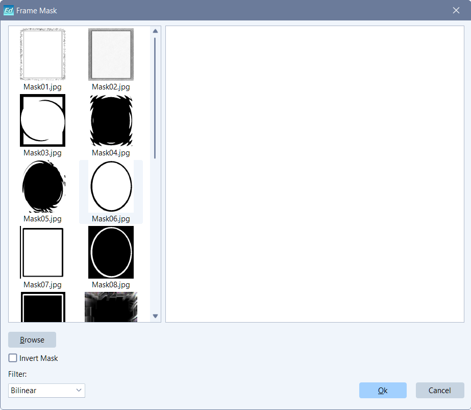 - Mask01 .. Mask20 are frame masks. Selecting some mask image preview displays.