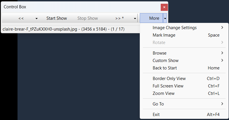 - The Control Box may be positioned anywhere on the Desktop (including an Extended Desktop) and remains visible in Full Screen view. It provides a small subset of the controls available from the Main toolbar in Normal view: