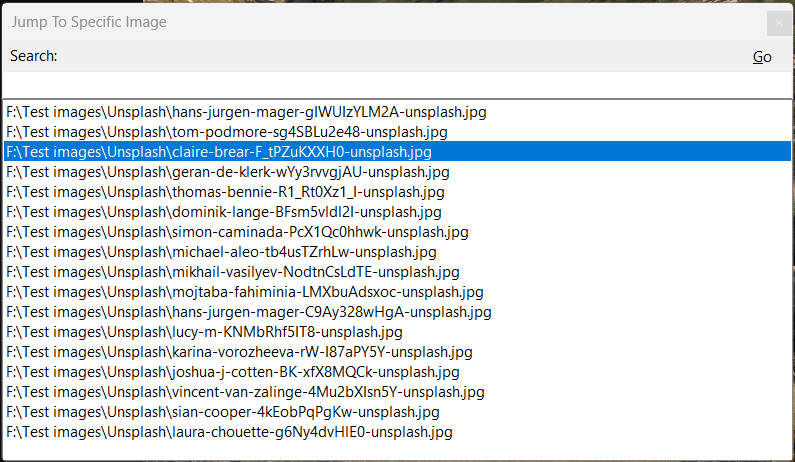 UsageSlide Show Slide Show - Jump To Specific Image Previous Top Next Search - Searches first occurrence in list of images (F3 searches next occurrence) Go - Jumps to selected image and show will continue from that point