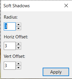 UsageEditor Editor - Soft Shadows Previous Top Next Soft Shadows dialog adds soft shadow around image. These values controls what kind of soft shadow is added: Radius Horiz Offset Vert Offset