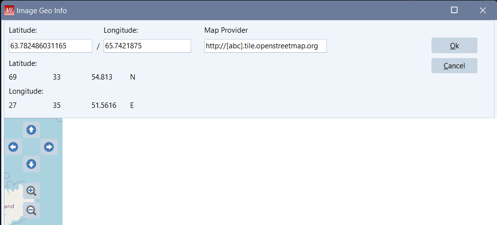 UsageViewer Viewer - Image Geo Info Previous Top Next Latitude / Longitude Ok - Marks Latitude (Dec,Min,Sec and Ref) / Longitude (Dec,Min,Sec and Ref) in to EXIF GPS tags Note! it will not directly Save EXIF Info so don't forget to Save EXIF Info Cancel - Closes Image Geo Info window without making changes