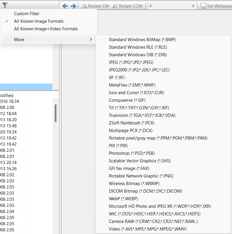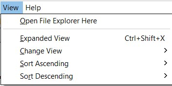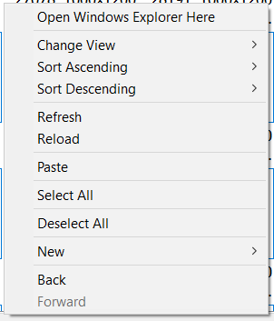 - Open File Explorer Here - Opens File Explorer to current selected folder - Expanded View - Expands Preview or Thumbview - Change View - Changes view to Icon, Small Icon, List, Report or Thumbnails - Sort Ascending - Sorts Ascending by Name, Size or Date - Sort Descending - Sorts Descending by Name, Size or Date - Toolbars -> Show Filter - Shows / Hides Filter Toolbar |