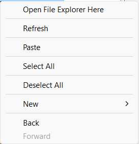 - Right click in file list view to display this pop-up where you can open file explorer to current selected folder, refresh file list, paste file(s), select all, select all files, deselect all, create folder or go back and forward