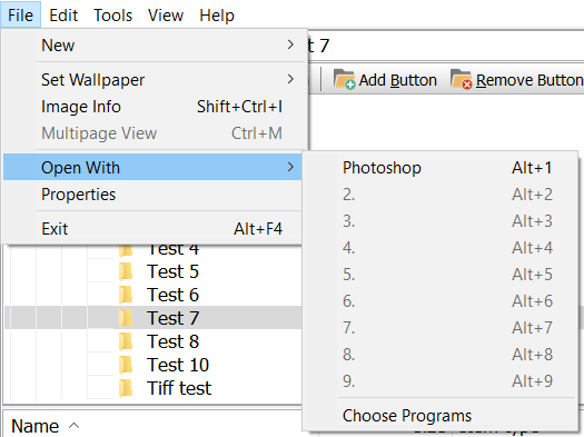 - New -> Folder - Creates new folder - Set Wallpaper - Set wallpaper Tiled, Centered or Stretched - Image Info - Displays image info - Multipage View - Displays Multipage View when there is more than one frame/page in image - Open With - 1..9 opens image with external program - Choose Programs displays External Programs Chooser (See External Programs Chooser) - Properties - Shows properties for selected file(s), folder(s) etc. - Exit - Closes the Viewer program |