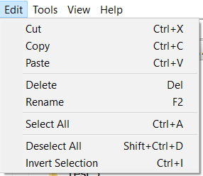 - Cut - Selected file(s) or folder(s) are marked for cutting - Copy - Selected file(s) or folder(s) are marked for copying - Paste - Pasting file(s) or folder(s) in to selected folder - Delete - Deletes file(s) or folder(s) - Rename - Rename file or folder - Select All - Selects all files & folders - Select All Files - Selects only files - Deselect All - Deselect's selected files & folders - Invert Selection - Inverts selection