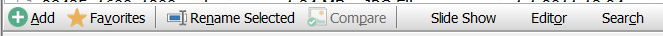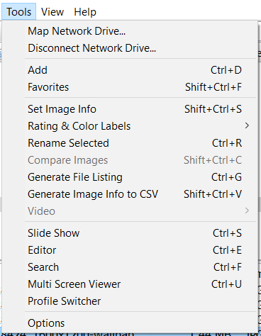 - Map Network Drive - Displays Map Network Drive window - Disconnect Network Drive - Displays Disconnect Network Drive window - Add - Adds selected files in to Favorites - Favorites - Displays Favorites window - Set Image Info - EXIF and IPTC info can be set to multiple images based on certain rules - Rating & Color Labels: - 1 - 5 Rating inserts rating to EXIF XP Rating - Color Labels (Later,Todo,Personal,Work, Important) inserts value to EXIF User Comment - Unrated and Uncolored removes EXIF values - Show Rating & Color Labels shows/hides Rating & Color Labels - Rename Selected - Renames Selected files based on certain rules - Compare Images - Displays Compare window and loads two selected images in to Compare window. This button is enabled only when two image files are selected - Generate File Listing - Generates file listing based on currently selected folder+header setting - Generate Image Info to CSV - Generates table of EXIF data from selected images as a Tab separated file - Video -> Play - Starts playing selected video in Video Player window - Slide Show - Starts Slide Show program with selected folder - Editor - Opens selected image(s) in to Editor - Search - Starts Search program with selected folder - Multi Screen Viewer - Listing selected image(s) in to Multi Screen Viewer - Profile Switcher - Starts Profile Switcher program and closes Viewer program - Options - Displays options window