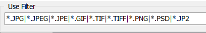 Note: Filter must be started with * or . No mixing combinations are allowed ex. *.jpg|.psd